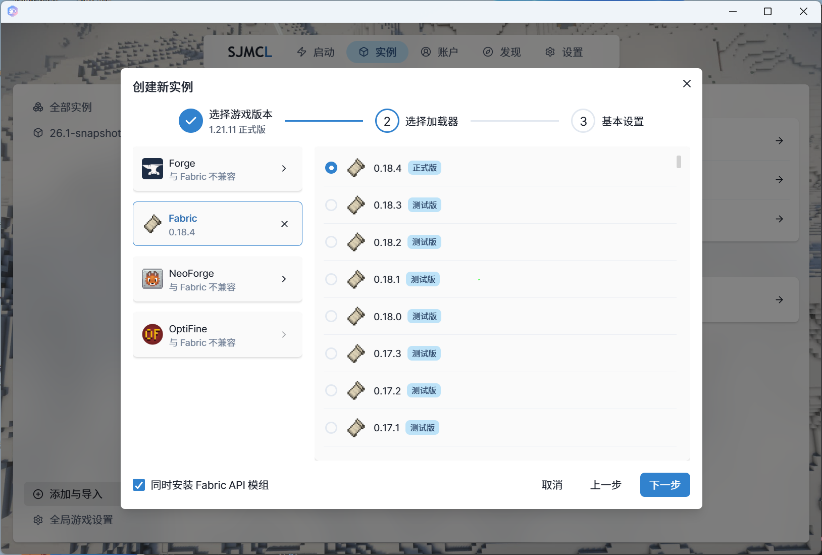 When you install a new game client, you will see 4 mod loaders available: Forge, Fabric, NeoForge, and Quilt.