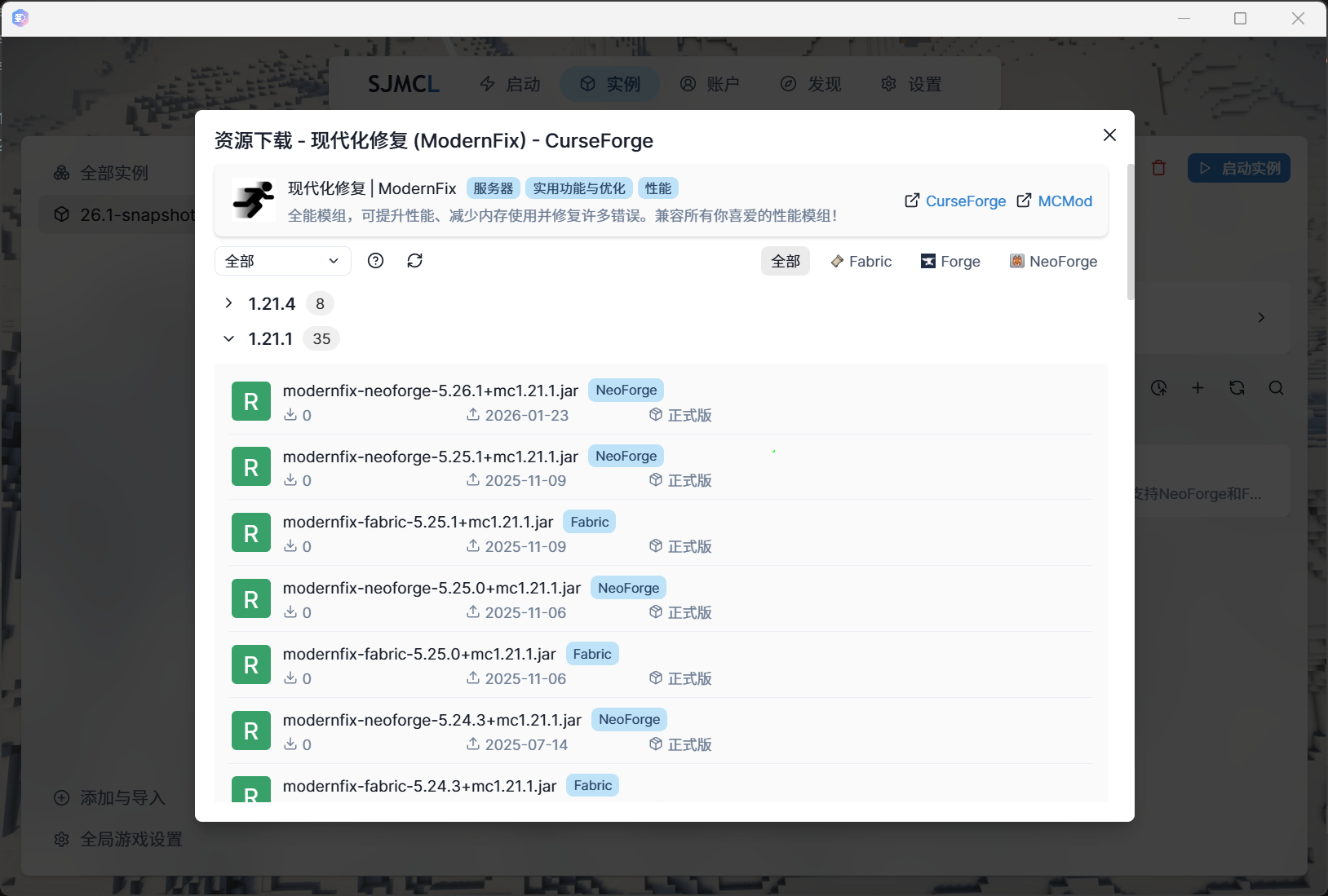 SJMCL has built-in support for searching and downloading from CurseForge and Modrinth, with bilingual search support. If you can't find what you're looking for in your language, try searching in English.